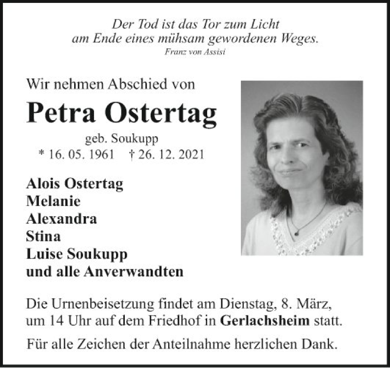 Hier finden Sie alle Traueranzeigen aus der Zeitung, die bisher für Petra Ostertag erschienen sind. Weitere Traueranzeigen, die in der Zeitung erscheinen, werden hier ebenfalls aufgelistet