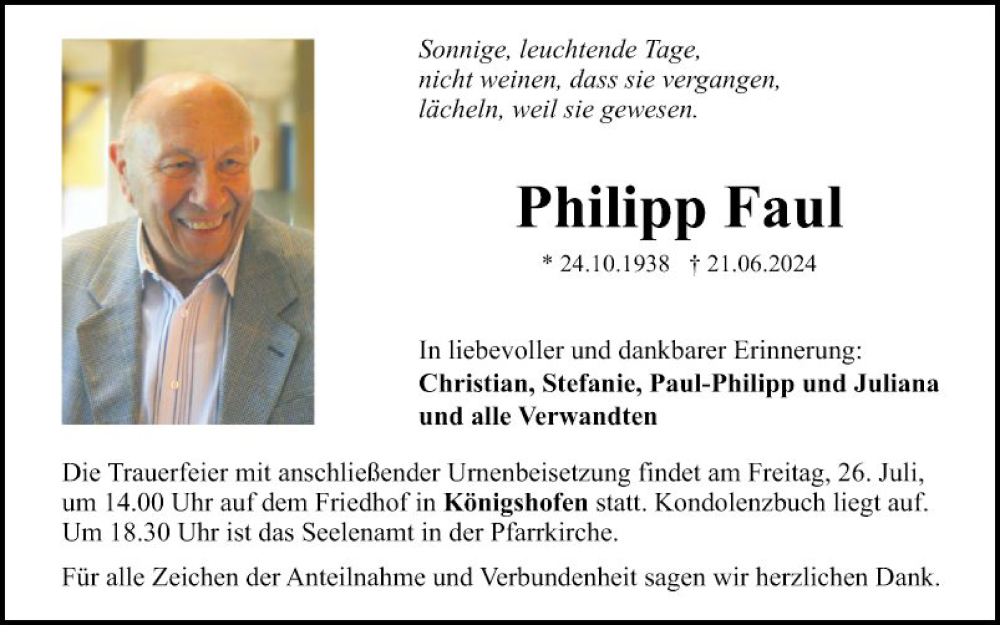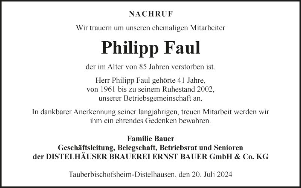 Hier finden Sie alle Traueranzeigen aus der Zeitung, die bisher für Philipp Faul erschienen sind. Weitere Traueranzeigen, die in der Zeitung erscheinen, werden hier ebenfalls aufgelistet