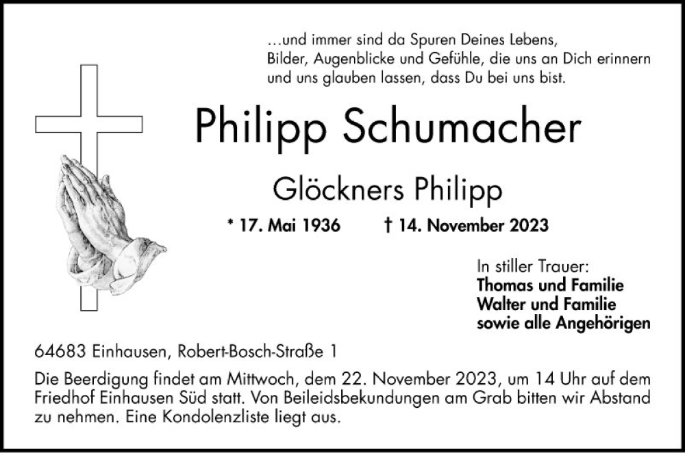 Hier finden Sie alle Traueranzeigen aus der Zeitung, die bisher für Philipp Schumacher erschienen sind. Weitere Traueranzeigen, die in der Zeitung erscheinen, werden hier ebenfalls aufgelistet