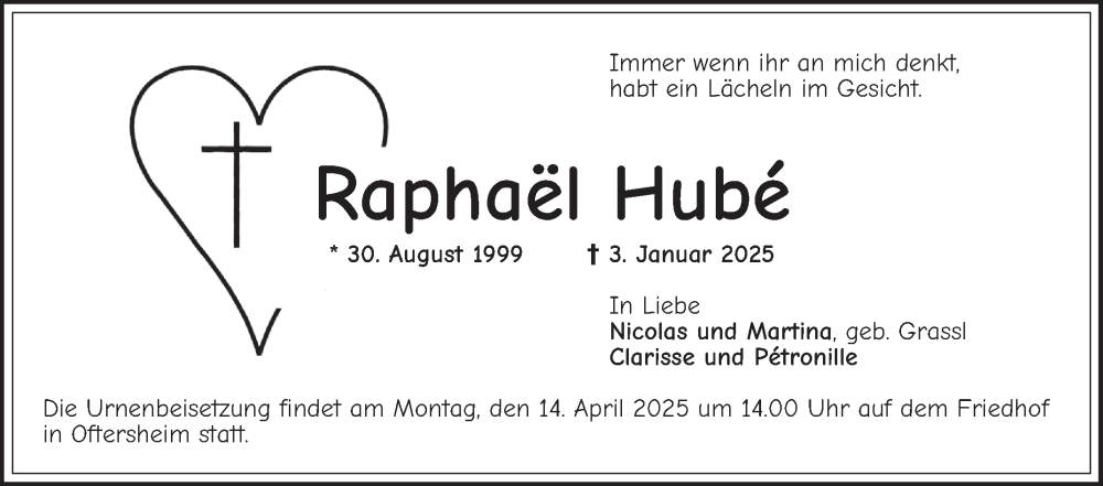 Hier finden Sie alle Traueranzeigen aus der Zeitung, die bisher für Raphael Hubé erschienen sind. Weitere Traueranzeigen, die in der Zeitung erscheinen, werden hier ebenfalls aufgelistet