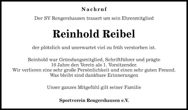 Hier finden Sie alle Traueranzeigen aus der Zeitung, die bisher für Reinhold Reibel erschienen sind. Weitere Traueranzeigen, die in der Zeitung erscheinen, werden hier ebenfalls aufgelistet