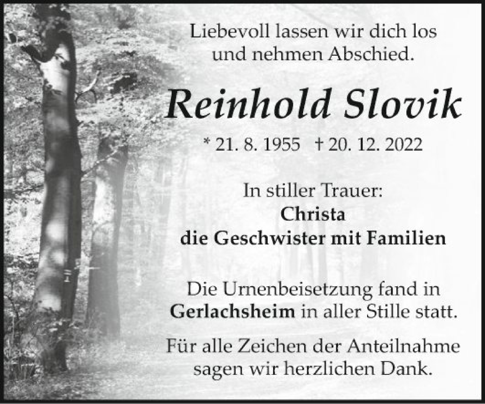 Hier finden Sie alle Traueranzeigen aus der Zeitung, die bisher für Reinhold Slovik erschienen sind. Weitere Traueranzeigen, die in der Zeitung erscheinen, werden hier ebenfalls aufgelistet