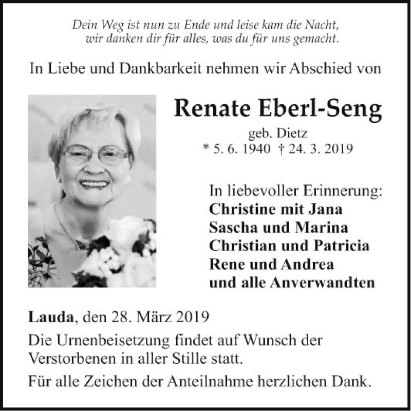 Hier finden Sie alle Traueranzeigen aus der Zeitung, die bisher für Renate Eberl-Seng erschienen sind. Weitere Traueranzeigen, die in der Zeitung erscheinen, werden hier ebenfalls aufgelistet