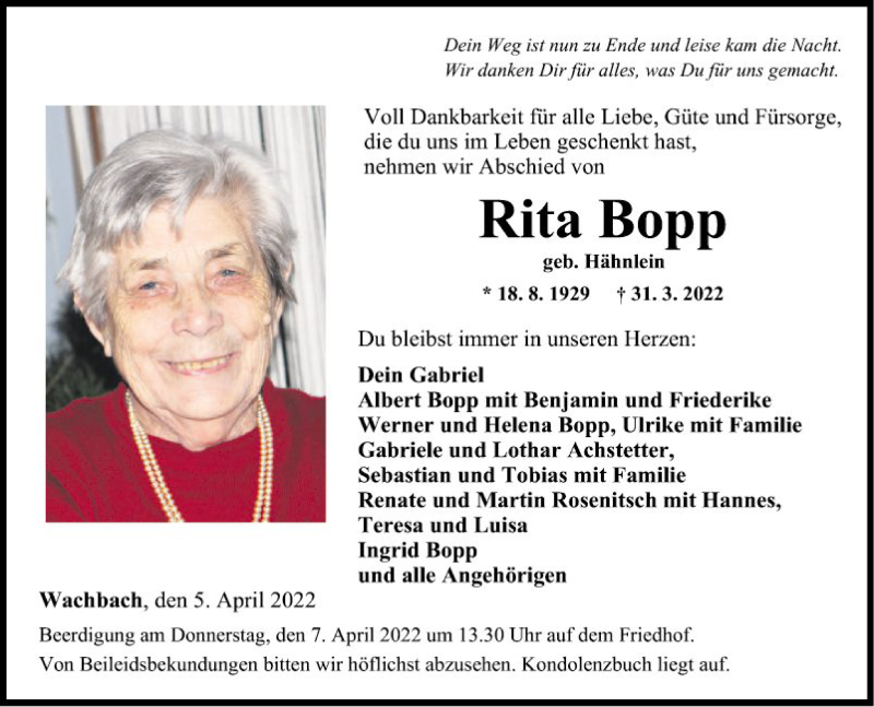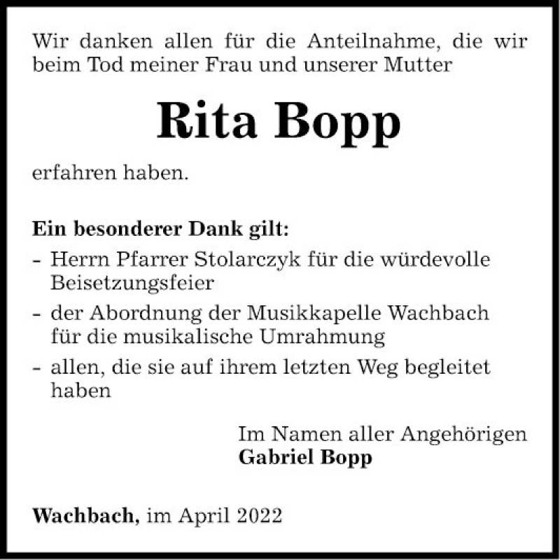 Hier finden Sie alle Traueranzeigen aus der Zeitung, die bisher für Rita Bopp erschienen sind. Weitere Traueranzeigen, die in der Zeitung erscheinen, werden hier ebenfalls aufgelistet