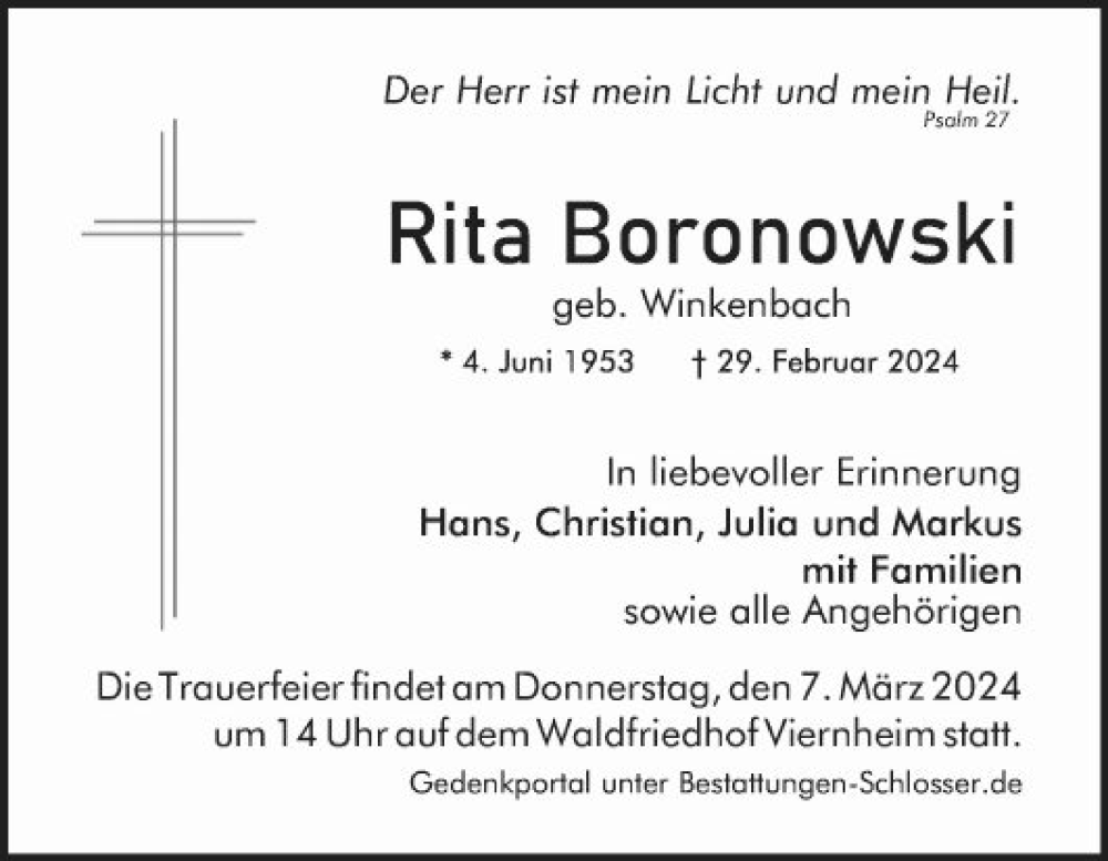 Hier finden Sie alle Traueranzeigen aus der Zeitung, die bisher für Rita Boronowski erschienen sind. Weitere Traueranzeigen, die in der Zeitung erscheinen, werden hier ebenfalls aufgelistet