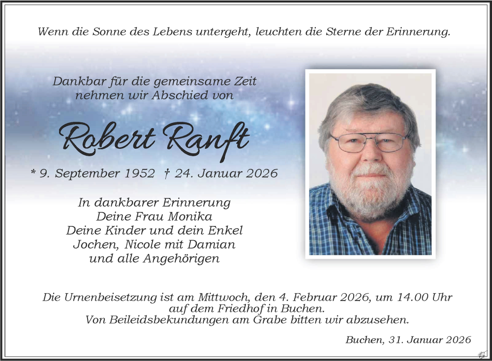 Hier finden Sie alle Traueranzeigen aus der Zeitung, die bisher für Robert Ranft erschienen sind. Weitere Traueranzeigen, die in der Zeitung erscheinen, werden hier ebenfalls aufgelistet
