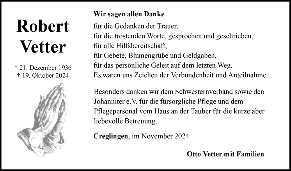 Hier finden Sie alle Traueranzeigen aus der Zeitung, die bisher für Robert Vetter erschienen sind. Weitere Traueranzeigen, die in der Zeitung erscheinen, werden hier ebenfalls aufgelistet