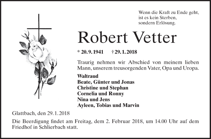 Hier finden Sie alle Traueranzeigen aus der Zeitung, die bisher für Robert Vetter erschienen sind. Weitere Traueranzeigen, die in der Zeitung erscheinen, werden hier ebenfalls aufgelistet