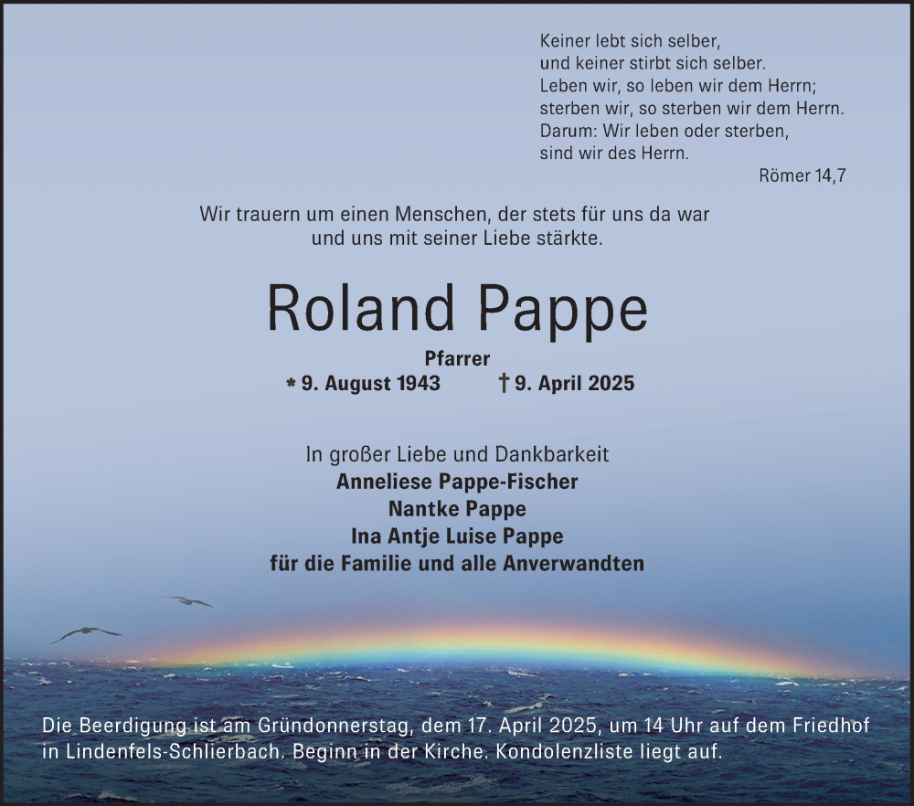 Hier finden Sie alle Traueranzeigen aus der Zeitung, die bisher für Roland Pappe erschienen sind. Weitere Traueranzeigen, die in der Zeitung erscheinen, werden hier ebenfalls aufgelistet