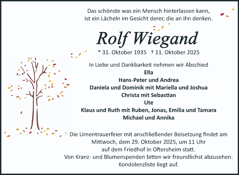 Hier finden Sie alle Traueranzeigen aus der Zeitung, die bisher für Rolf Wiegand erschienen sind. Weitere Traueranzeigen, die in der Zeitung erscheinen, werden hier ebenfalls aufgelistet