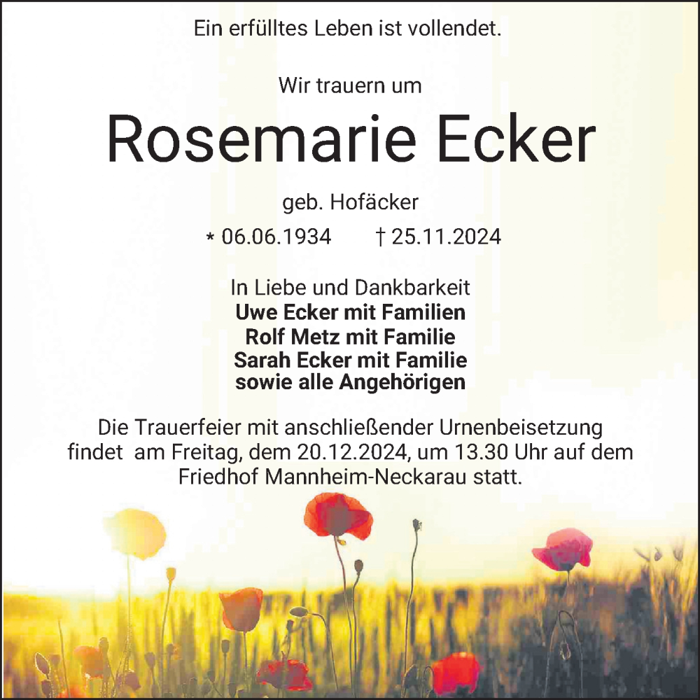 Hier finden Sie alle Traueranzeigen aus der Zeitung, die bisher für Rosemarie Ecker erschienen sind. Weitere Traueranzeigen, die in der Zeitung erscheinen, werden hier ebenfalls aufgelistet