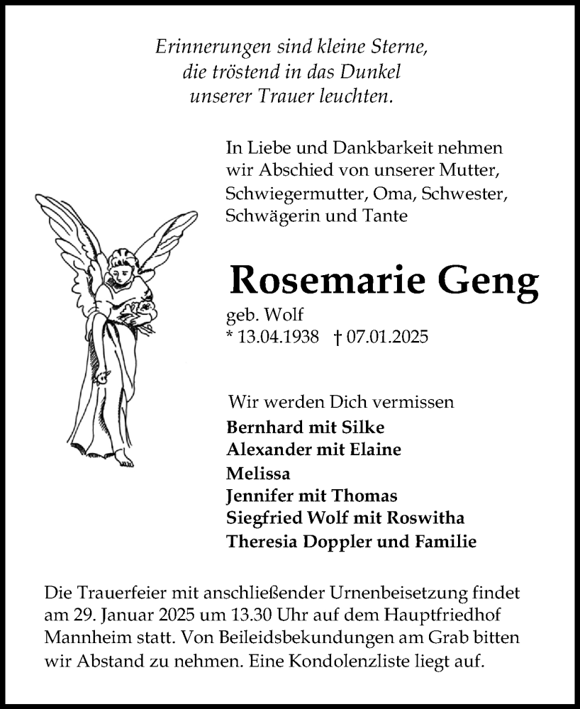 Hier finden Sie alle Traueranzeigen aus der Zeitung, die bisher für Rosemarie Geng erschienen sind. Weitere Traueranzeigen, die in der Zeitung erscheinen, werden hier ebenfalls aufgelistet