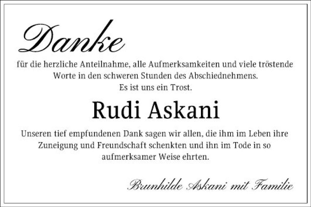 Hier finden Sie alle Traueranzeigen aus der Zeitung, die bisher für Rudi Askani erschienen sind. Weitere Traueranzeigen, die in der Zeitung erscheinen, werden hier ebenfalls aufgelistet