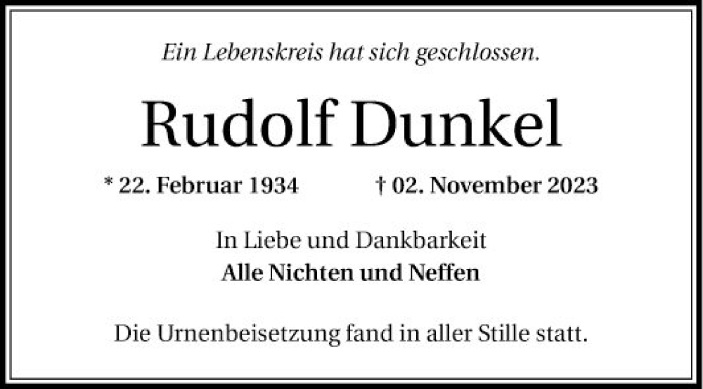 Hier finden Sie alle Traueranzeigen aus der Zeitung, die bisher für Rudolf Dunkel erschienen sind. Weitere Traueranzeigen, die in der Zeitung erscheinen, werden hier ebenfalls aufgelistet