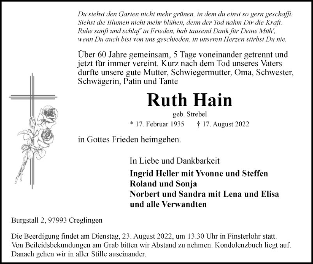 Hier finden Sie alle Traueranzeigen aus der Zeitung, die bisher für Ruth Hain erschienen sind. Weitere Traueranzeigen, die in der Zeitung erscheinen, werden hier ebenfalls aufgelistet