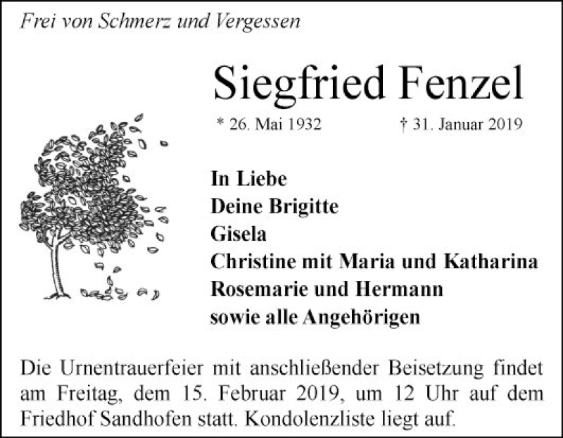 Hier finden Sie alle Traueranzeigen aus der Zeitung, die bisher für Siegfried Fenzel erschienen sind. Weitere Traueranzeigen, die in der Zeitung erscheinen, werden hier ebenfalls aufgelistet