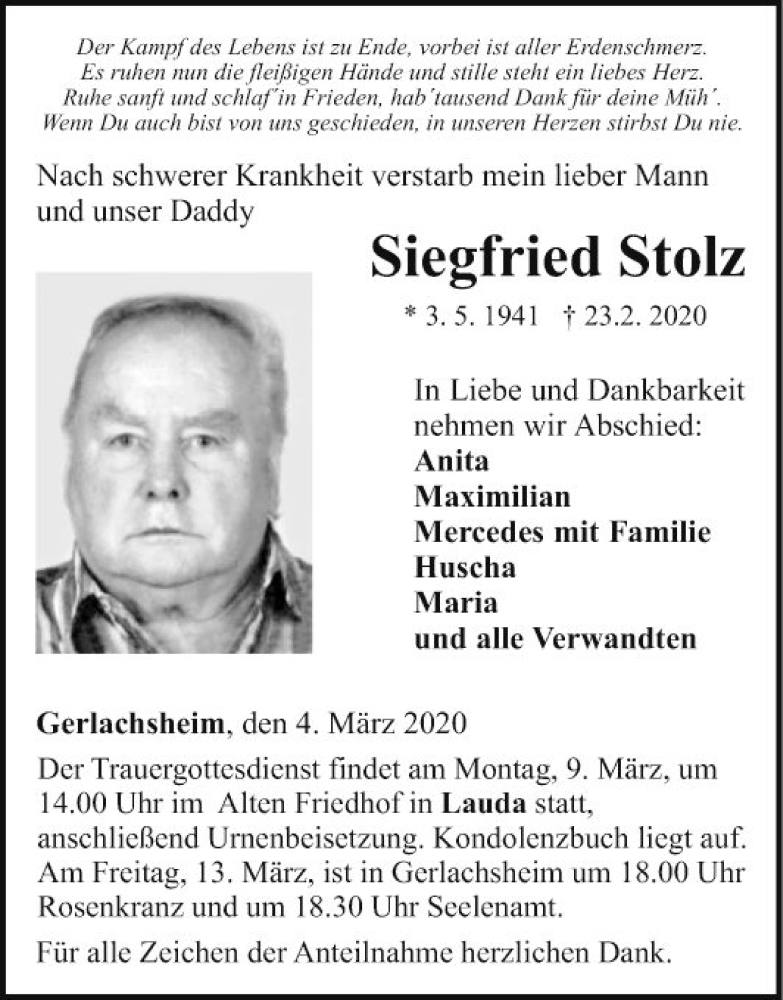 Hier finden Sie alle Traueranzeigen aus der Zeitung, die bisher für Siegfried Stolz erschienen sind. Weitere Traueranzeigen, die in der Zeitung erscheinen, werden hier ebenfalls aufgelistet