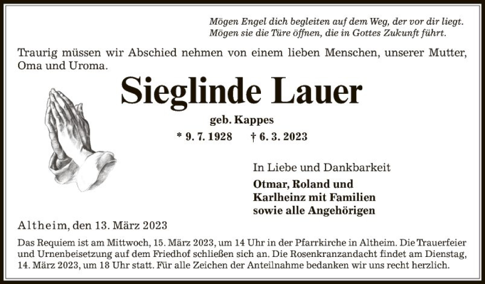 Hier finden Sie alle Traueranzeigen aus der Zeitung, die bisher für Sieglinde Lauer erschienen sind. Weitere Traueranzeigen, die in der Zeitung erscheinen, werden hier ebenfalls aufgelistet
