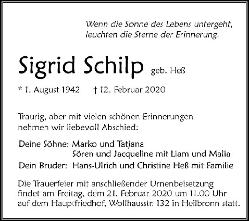 Hier finden Sie alle Traueranzeigen aus der Zeitung, die bisher für Sigrid Schilp erschienen sind. Weitere Traueranzeigen, die in der Zeitung erscheinen, werden hier ebenfalls aufgelistet