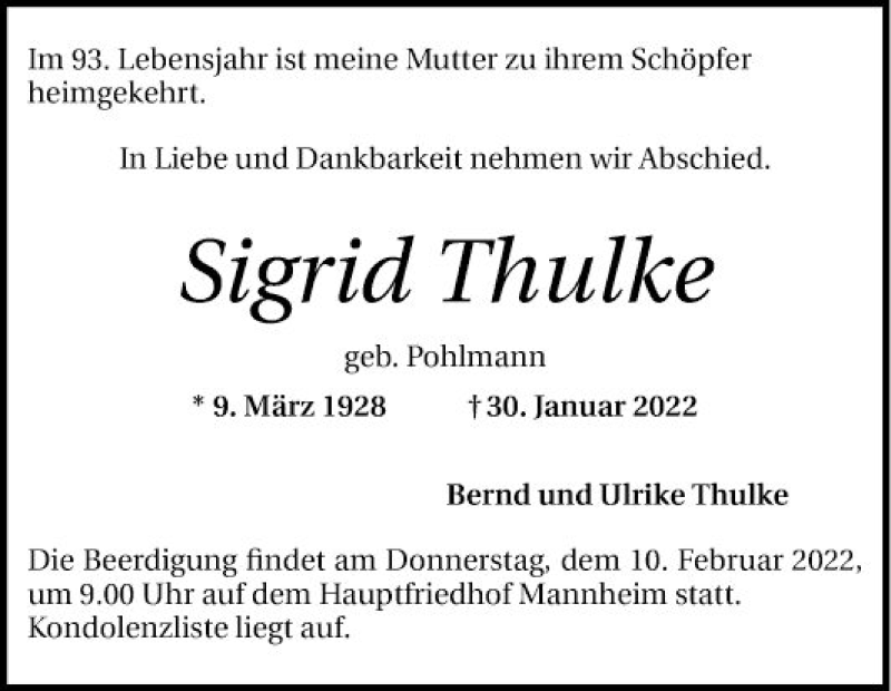 Hier finden Sie alle Traueranzeigen aus der Zeitung, die bisher für Sigrid Thulke erschienen sind. Weitere Traueranzeigen, die in der Zeitung erscheinen, werden hier ebenfalls aufgelistet
