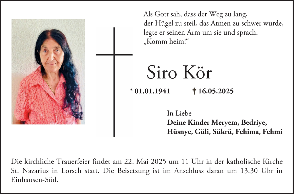 Hier finden Sie alle Traueranzeigen aus der Zeitung, die bisher für Siro Kör erschienen sind. Weitere Traueranzeigen, die in der Zeitung erscheinen, werden hier ebenfalls aufgelistet