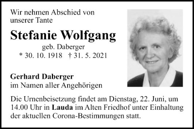 Hier finden Sie alle Traueranzeigen aus der Zeitung, die bisher für Stefanie Wolfgang erschienen sind. Weitere Traueranzeigen, die in der Zeitung erscheinen, werden hier ebenfalls aufgelistet