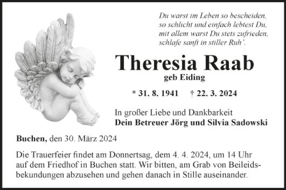 Hier finden Sie alle Traueranzeigen aus der Zeitung, die bisher für Theresia Raab erschienen sind. Weitere Traueranzeigen, die in der Zeitung erscheinen, werden hier ebenfalls aufgelistet
