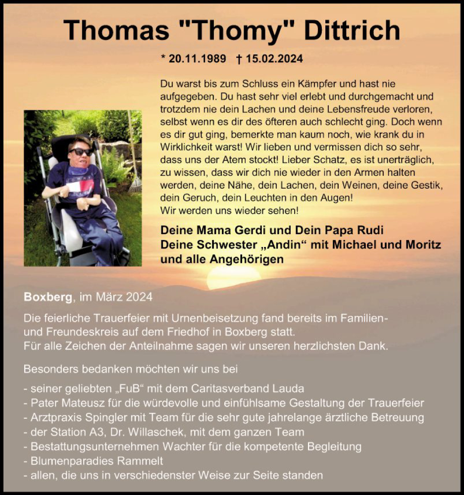 Hier finden Sie alle Traueranzeigen aus der Zeitung, die bisher für Thomas Dittrich erschienen sind. Weitere Traueranzeigen, die in der Zeitung erscheinen, werden hier ebenfalls aufgelistet