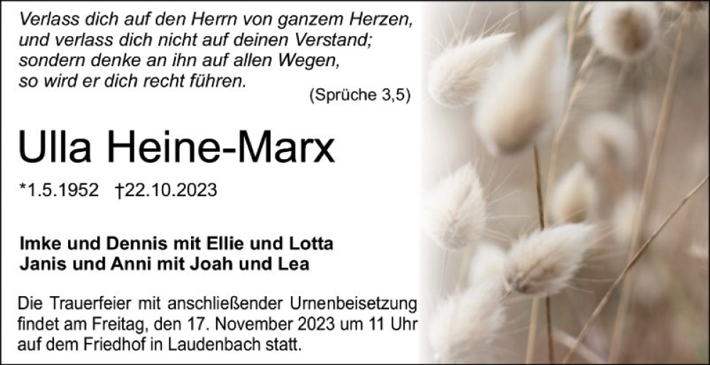 Hier finden Sie alle Traueranzeigen aus der Zeitung, die bisher für Ulla Heine-Marx erschienen sind. Weitere Traueranzeigen, die in der Zeitung erscheinen, werden hier ebenfalls aufgelistet
