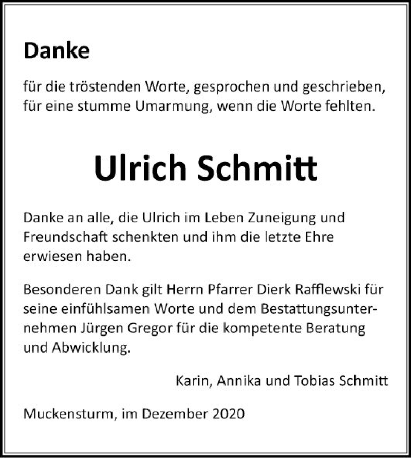 Hier finden Sie alle Traueranzeigen aus der Zeitung, die bisher für Ulrich Schmitt erschienen sind. Weitere Traueranzeigen, die in der Zeitung erscheinen, werden hier ebenfalls aufgelistet