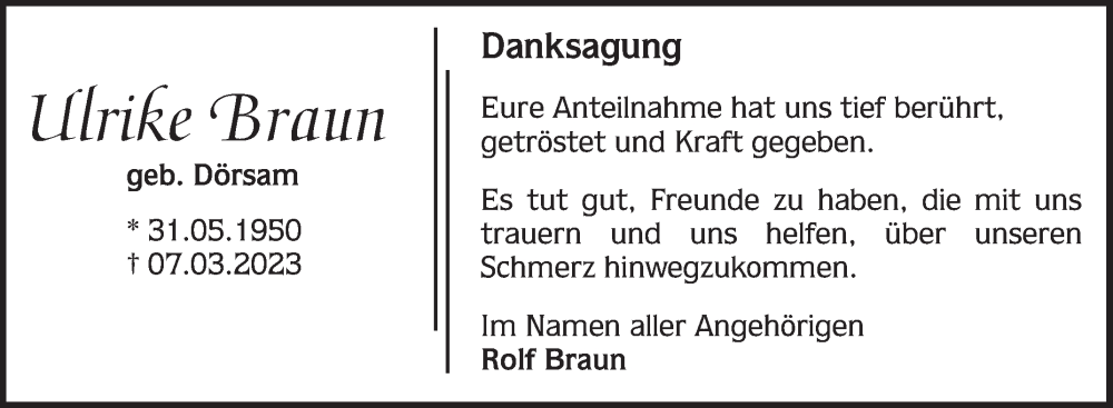 Hier finden Sie alle Traueranzeigen aus der Zeitung, die bisher für Ulrike Braun erschienen sind. Weitere Traueranzeigen, die in der Zeitung erscheinen, werden hier ebenfalls aufgelistet