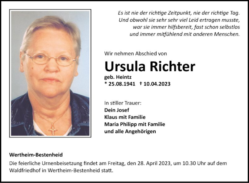 Hier finden Sie alle Traueranzeigen aus der Zeitung, die bisher für Ursula Richter erschienen sind. Weitere Traueranzeigen, die in der Zeitung erscheinen, werden hier ebenfalls aufgelistet