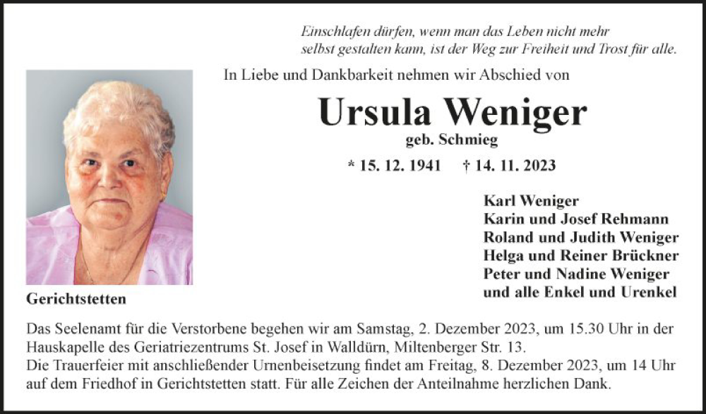 Hier finden Sie alle Traueranzeigen aus der Zeitung, die bisher für Ursula Weniger erschienen sind. Weitere Traueranzeigen, die in der Zeitung erscheinen, werden hier ebenfalls aufgelistet