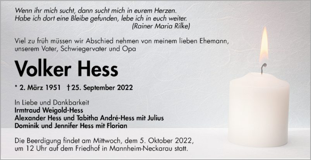 Hier finden Sie alle Traueranzeigen aus der Zeitung, die bisher für Volker Hess erschienen sind. Weitere Traueranzeigen, die in der Zeitung erscheinen, werden hier ebenfalls aufgelistet