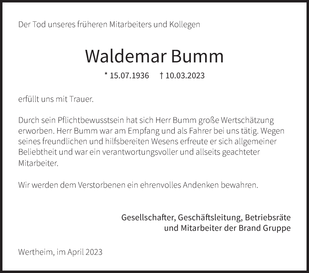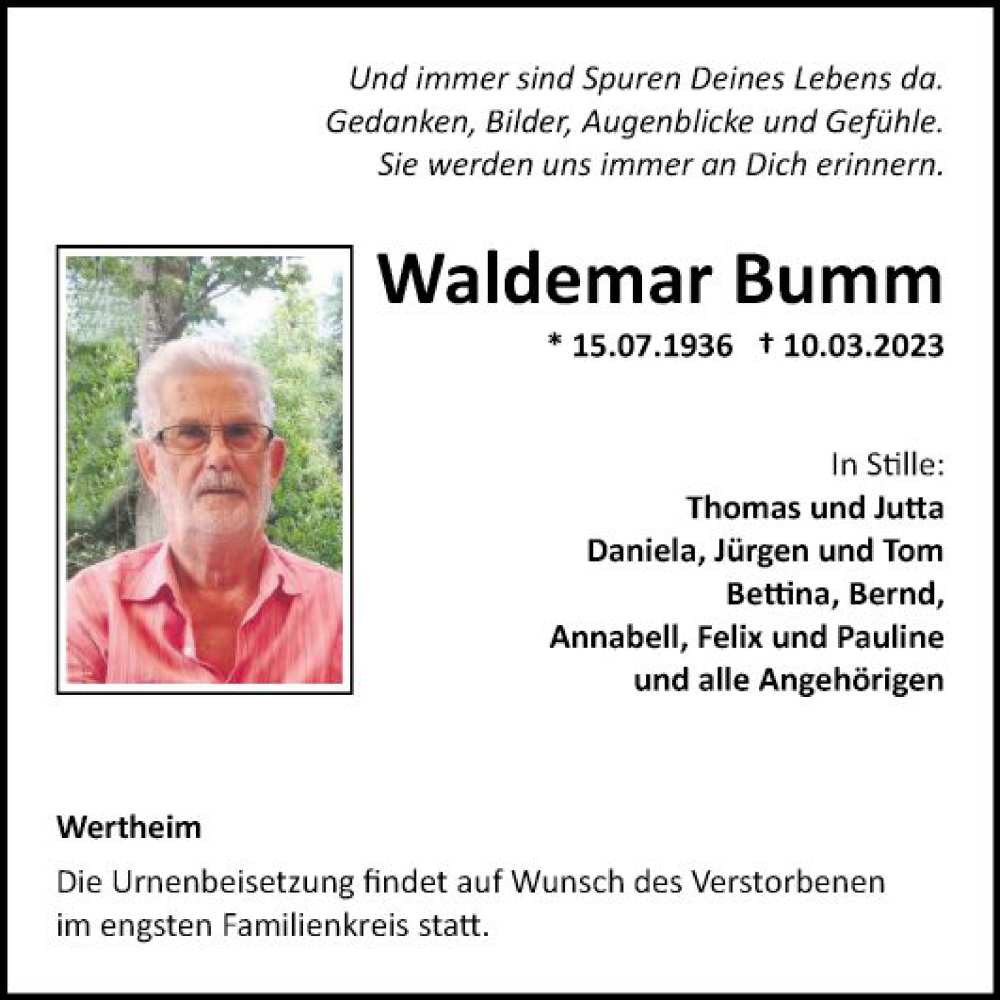 Hier finden Sie alle Traueranzeigen aus der Zeitung, die bisher für Waldemar Bumm erschienen sind. Weitere Traueranzeigen, die in der Zeitung erscheinen, werden hier ebenfalls aufgelistet