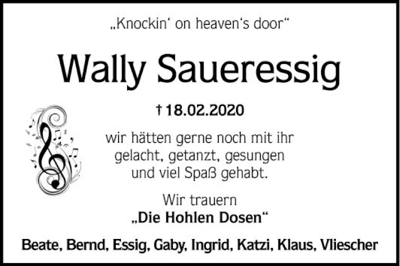Hier finden Sie alle Traueranzeigen aus der Zeitung, die bisher für Wally Saueressig erschienen sind. Weitere Traueranzeigen, die in der Zeitung erscheinen, werden hier ebenfalls aufgelistet