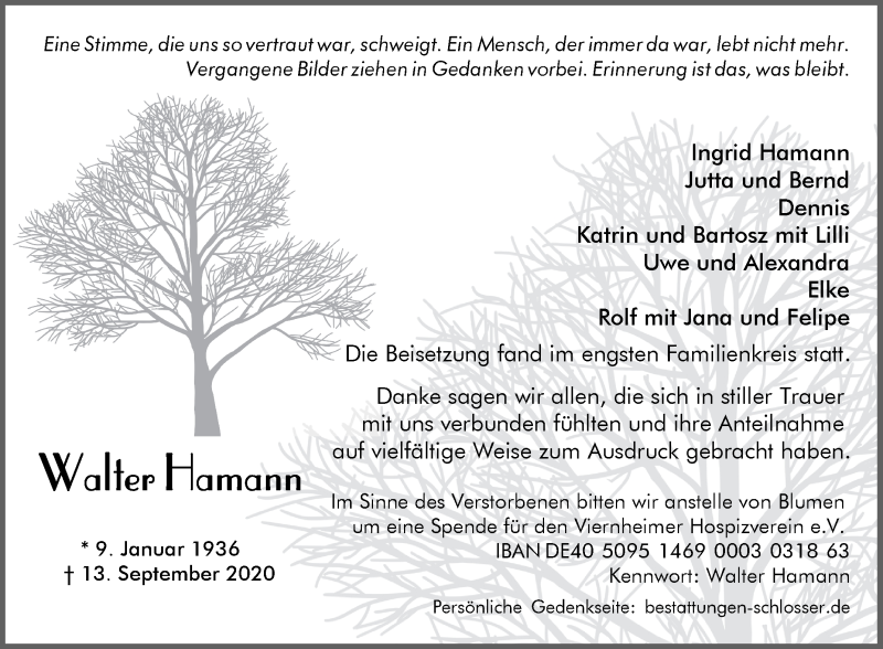 Hier finden Sie alle Traueranzeigen aus der Zeitung, die bisher für Walter Hamann erschienen sind. Weitere Traueranzeigen, die in der Zeitung erscheinen, werden hier ebenfalls aufgelistet