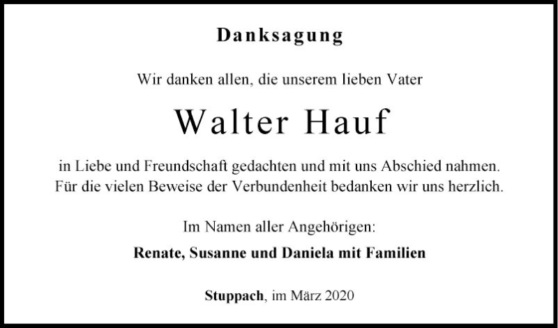 Hier finden Sie alle Traueranzeigen aus der Zeitung, die bisher für Walter Hauf erschienen sind. Weitere Traueranzeigen, die in der Zeitung erscheinen, werden hier ebenfalls aufgelistet