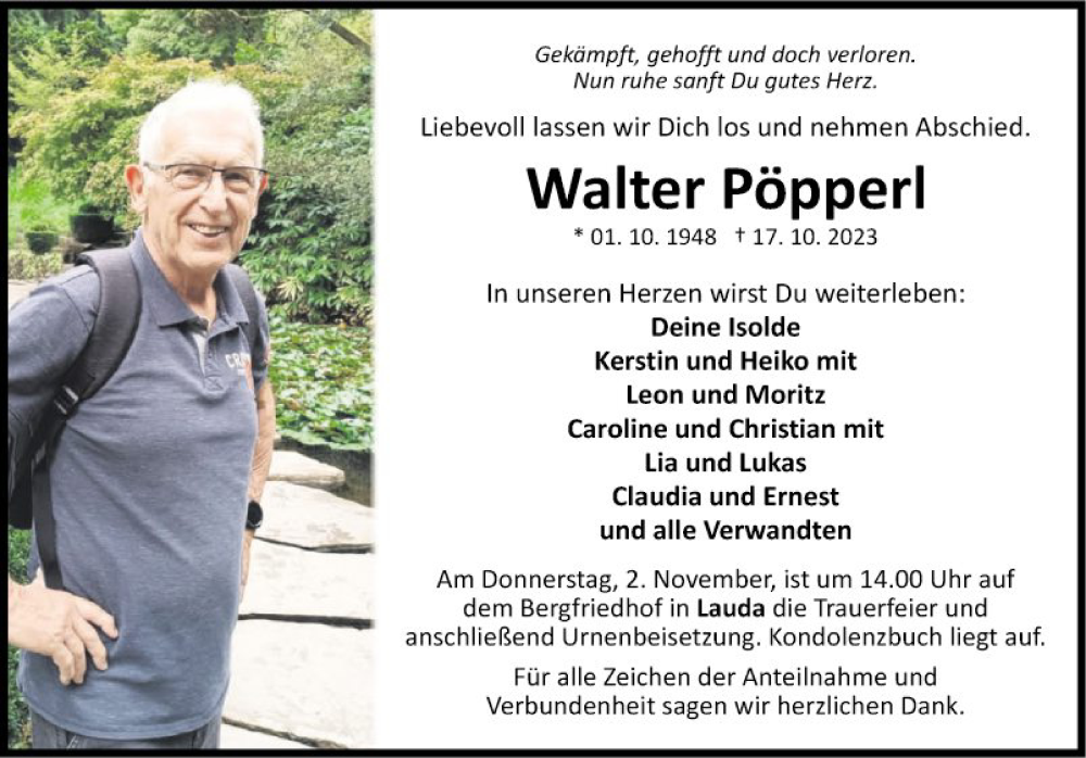 Hier finden Sie alle Traueranzeigen aus der Zeitung, die bisher für Walter Pöpperl erschienen sind. Weitere Traueranzeigen, die in der Zeitung erscheinen, werden hier ebenfalls aufgelistet