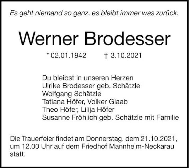 Hier finden Sie alle Traueranzeigen aus der Zeitung, die bisher für Werner Brodesser erschienen sind. Weitere Traueranzeigen, die in der Zeitung erscheinen, werden hier ebenfalls aufgelistet