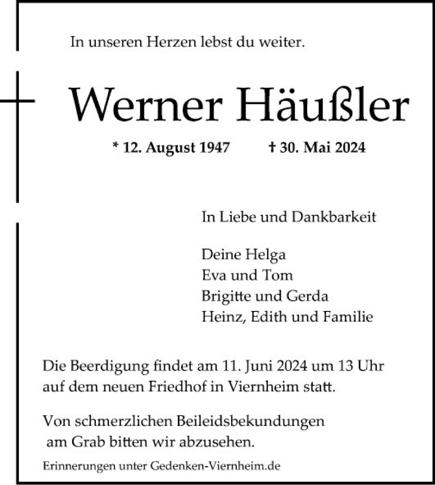 Hier finden Sie alle Traueranzeigen aus der Zeitung, die bisher für Werner Häußler erschienen sind. Weitere Traueranzeigen, die in der Zeitung erscheinen, werden hier ebenfalls aufgelistet