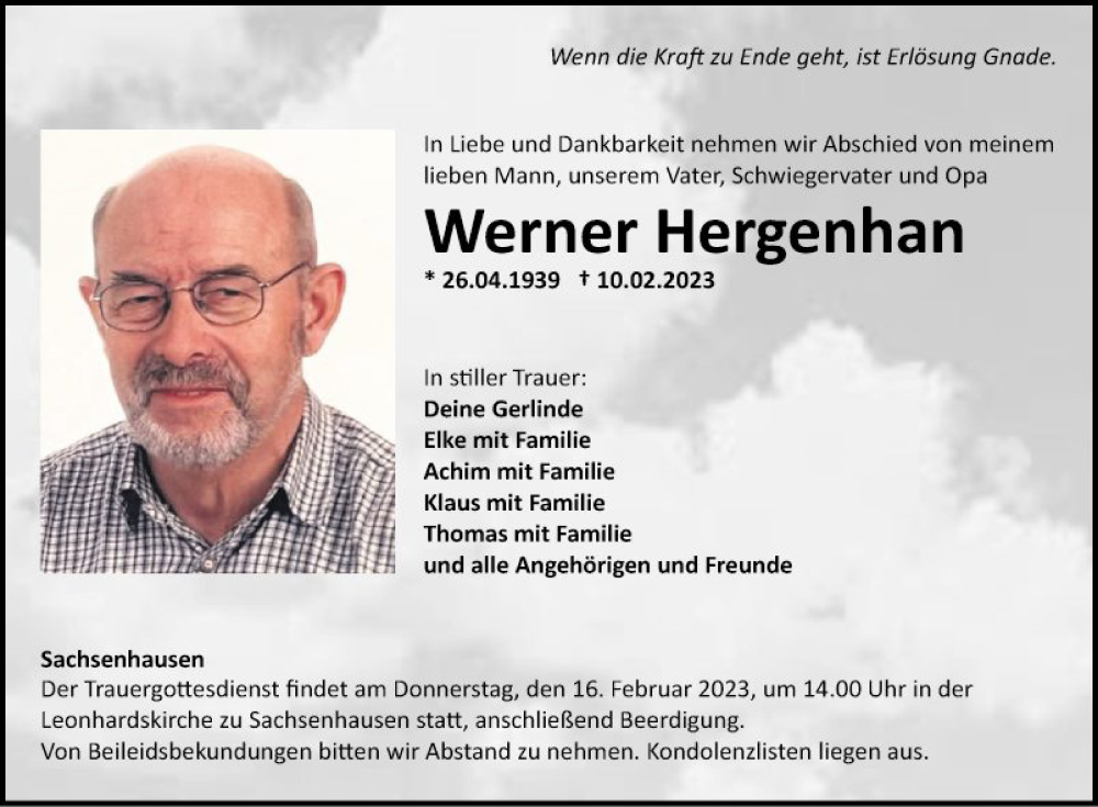 Hier finden Sie alle Traueranzeigen aus der Zeitung, die bisher für Werner Hergenhan erschienen sind. Weitere Traueranzeigen, die in der Zeitung erscheinen, werden hier ebenfalls aufgelistet