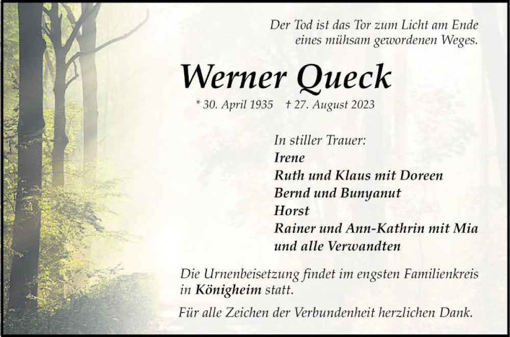 Hier finden Sie alle Traueranzeigen aus der Zeitung, die bisher für Werner Queck erschienen sind. Weitere Traueranzeigen, die in der Zeitung erscheinen, werden hier ebenfalls aufgelistet
