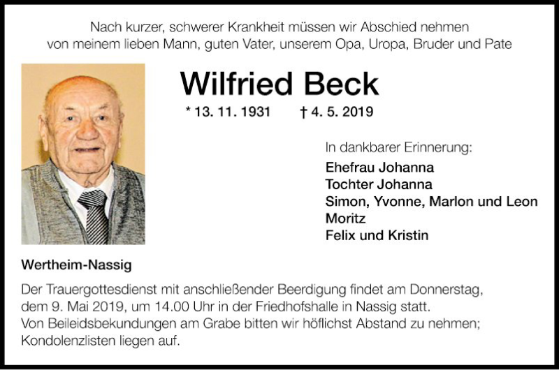 Hier finden Sie alle Traueranzeigen aus der Zeitung, die bisher für Wilfried Beck erschienen sind. Weitere Traueranzeigen, die in der Zeitung erscheinen, werden hier ebenfalls aufgelistet