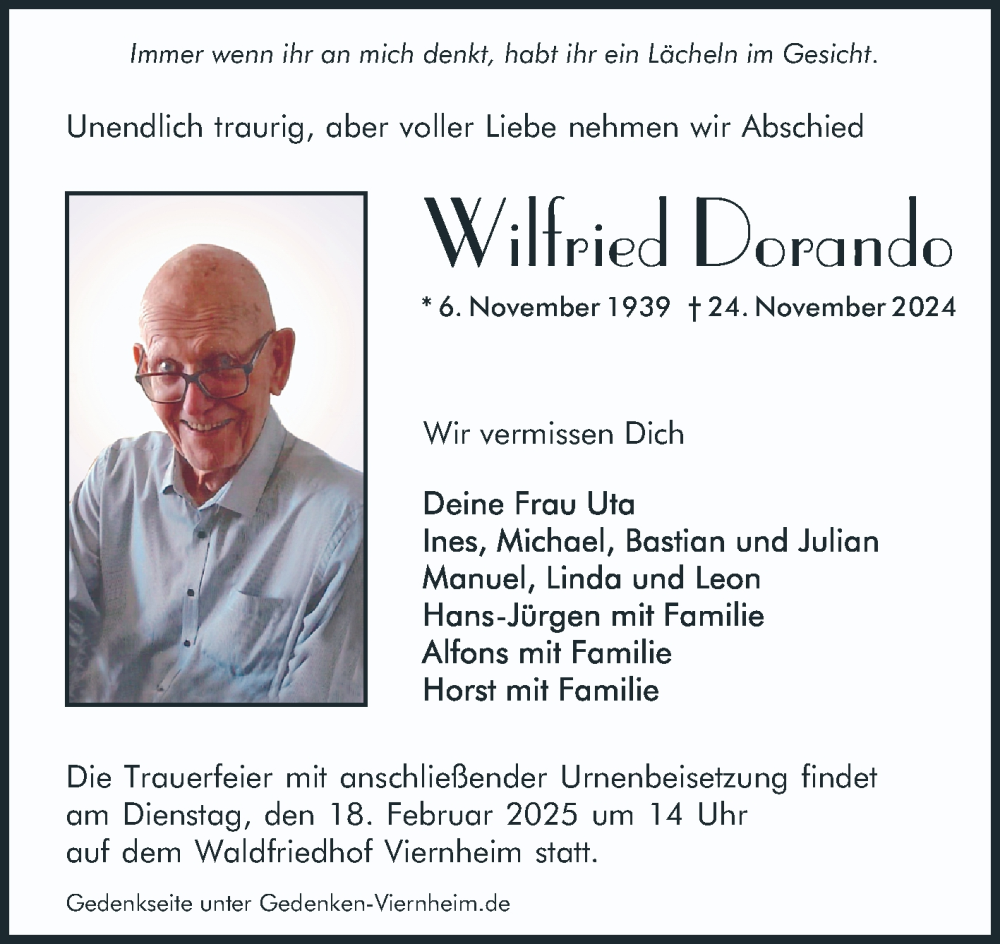 Hier finden Sie alle Traueranzeigen aus der Zeitung, die bisher für Wilfried Dorando erschienen sind. Weitere Traueranzeigen, die in der Zeitung erscheinen, werden hier ebenfalls aufgelistet