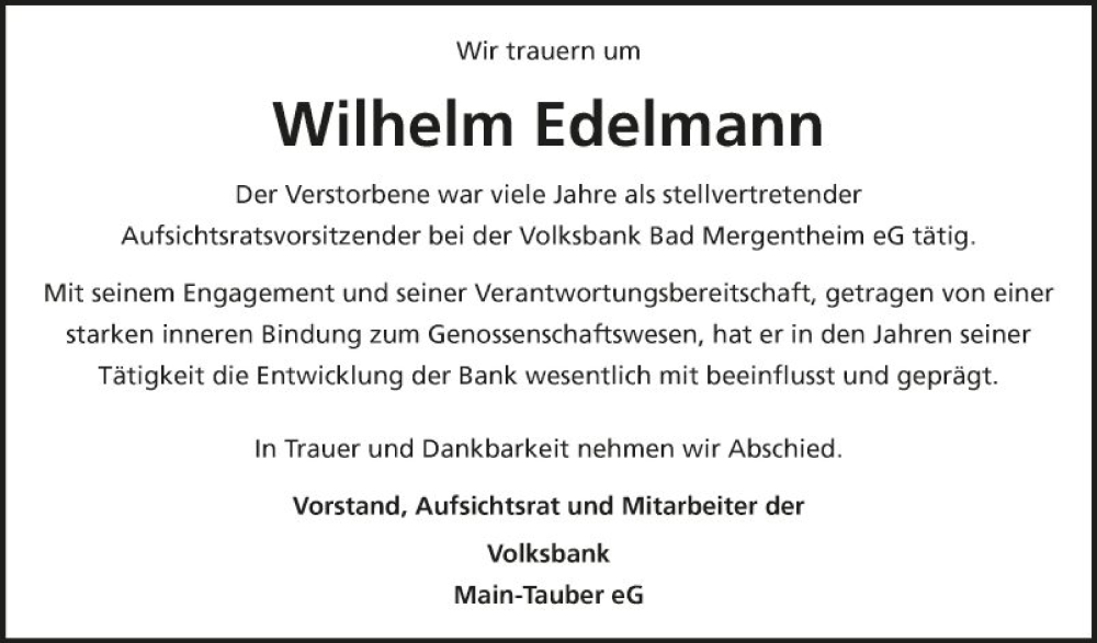 Hier finden Sie alle Traueranzeigen aus der Zeitung, die bisher für Wilhelm Edelmann erschienen sind. Weitere Traueranzeigen, die in der Zeitung erscheinen, werden hier ebenfalls aufgelistet