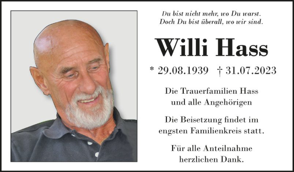 Hier finden Sie alle Traueranzeigen aus der Zeitung, die bisher für Willi Hass erschienen sind. Weitere Traueranzeigen, die in der Zeitung erscheinen, werden hier ebenfalls aufgelistet