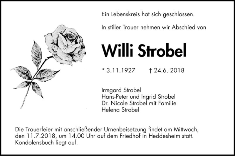 Hier finden Sie alle Traueranzeigen aus der Zeitung, die bisher für Willi Strobel erschienen sind. Weitere Traueranzeigen, die in der Zeitung erscheinen, werden hier ebenfalls aufgelistet