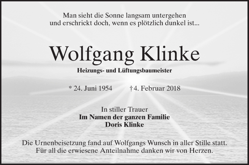 Hier finden Sie alle Traueranzeigen aus der Zeitung, die bisher für Wolfgang Klinke erschienen sind. Weitere Traueranzeigen, die in der Zeitung erscheinen, werden hier ebenfalls aufgelistet