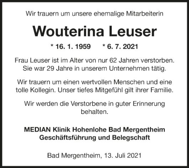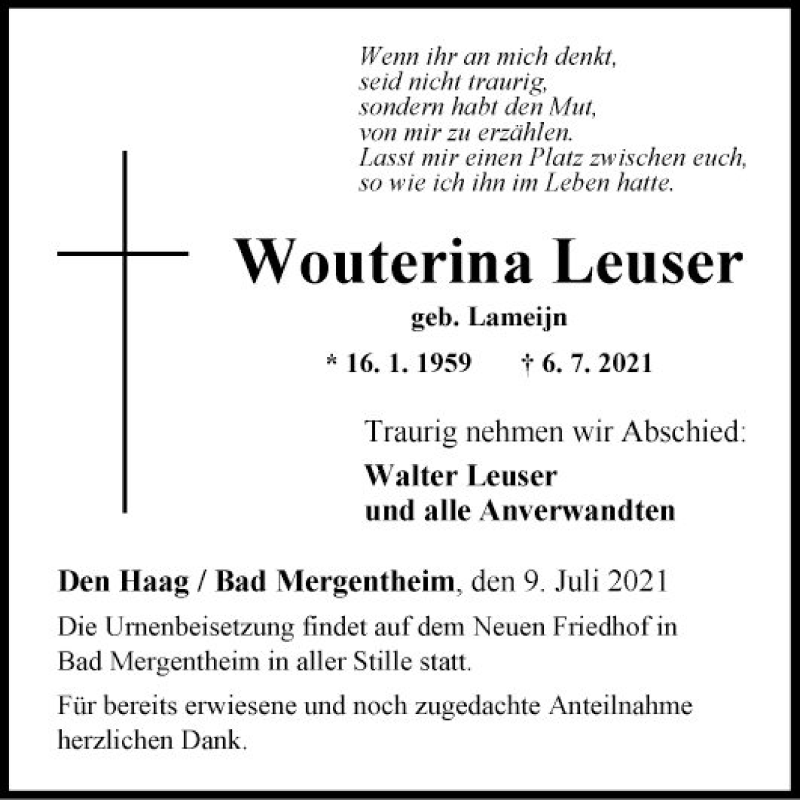 Hier finden Sie alle Traueranzeigen aus der Zeitung, die bisher für Wouterina Leuser erschienen sind. Weitere Traueranzeigen, die in der Zeitung erscheinen, werden hier ebenfalls aufgelistet